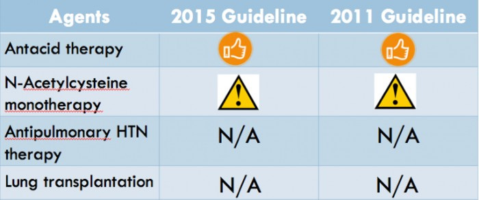 The relatively benign antacid therapies continued to get a conditional recommendation for their use. A Japanese RCT and an analysis of the NAC component of the aforementioned PANTHER-IPF trial re-affirmed the recommendation against using NAC as monotherapy. The committee punted decisions about single versus double-lung transplantation and antipulmonary hypertension therapy to the next iteration of guidelines.