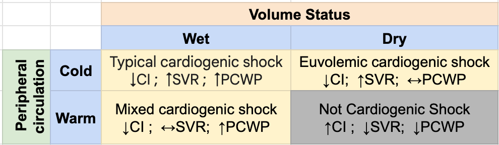The age-old 2x2 schema categorizing shock patients by volume status and peripheral circulation is still relevant and applicable to cardiogenic shock patients: