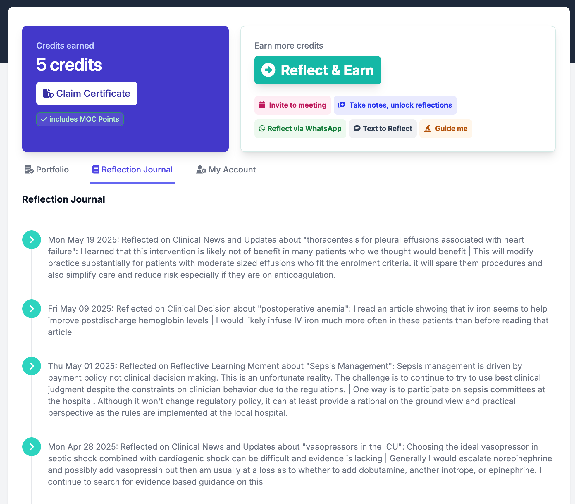 Reflect anytime, track your credits, download certificates, create LinkedIn summaries, and submit reflections via web, mobile, Smart Notebook, or WhatsApp. You can also sync your account to the ABIM or seven other medical boards to automatically earn maintenance of certification (MOC) points.