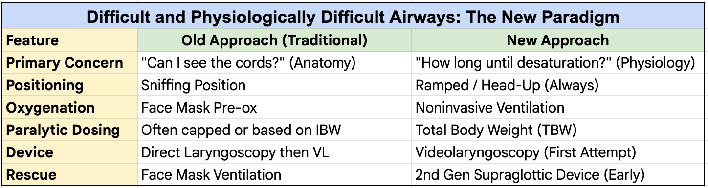 This is exemplified by the shift from a focus primarily on anatomically difficult airways, requiring an intense focus on technical considerations, to a more inclusive view of physiologically difficult airways, meaning patients who are more likely to become unstable (or moreso) during or after intubation.