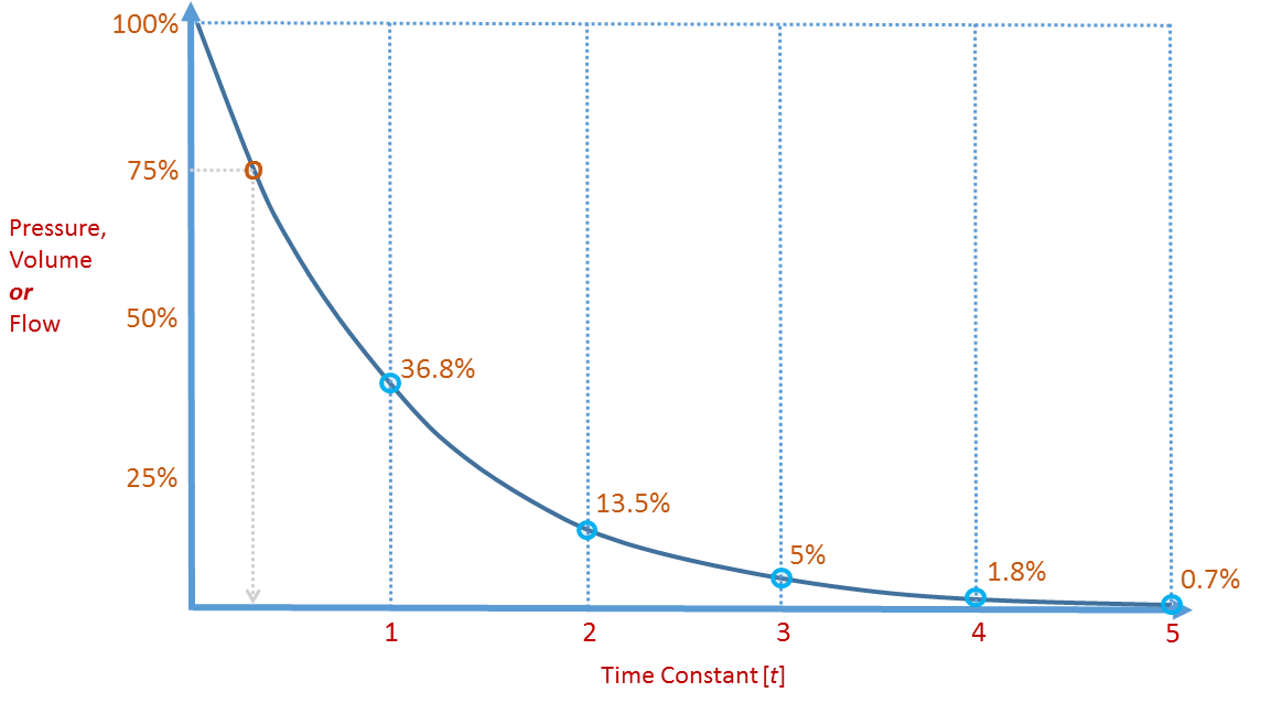 The time it takes for pressure, volume or flow to fall by 63% of its value is termed the time constant [t] and can be estimated for the respiratory system as the product of respiratory system compliance [Crs] and resistance [Rrs] [3]. For example, if an ARDS patient has a Crs of 30 mL/H2O and a total Rrs of 15 cmH2O/L/s [10], then t is 0.030 L/H2O x 15 cmH2O/L/s [note mL to L change for compliance] = 0.45 seconds. Accordingly, airway pressure is expected to decay by 63% following 0.45 seconds of expiration. If the initial airway pressure were 30 cm H2O, then following 0.45 seconds of expiration, the airway pressure is expected to fall by 19 cm H2O to 11 cm of H2O. Following another time constant, airway pressure would drop by another 63% [i.e. from 11 to 4 cm H2O]. Implicit in these calculations is that the P-Low is set to atmospheric pressure [0 cm H2O] which maximizes expiratory pressure and volume drop and therefore carbon dioxide excretion. Indeed, P-Low of zero is inherent to the P-APRV definition [1].