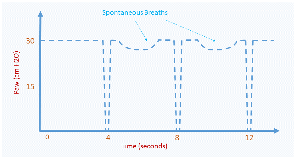 Imagine applying 30 cm H2O of continuous positive airway pressure [CPAP] to a spontaneously breathing patient; then every 5 seconds or so, the airway pressure is released from 30 to atmospheric pressure [0 cm H2O] for ~ 0.5 seconds. Following this momentary release, the 30 cm of H2O is rapidly re-applied. Importantly, the patient breathes on his or her own throughout; this is, essentially, APRV.