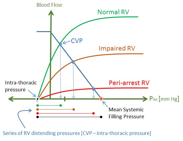 Figure 3: Again, right atrial pressure is the x-axis and cardiac output and venous return are the y-axis. As the heart is progressively arrested, its function curve shifts down and the CVP eventually becomes the mean systemic filling pressure at cardiac standstill [a horizontal cardiac function curve]. The distending pressure of the RV is indicated below the graph and colour-coded for each state of the RV - black is cardiac arrest. Even in hypovolemic pigs during cardiac arrest, a mean systemic filling pressure of 7 mmHg is expected to provide a significant RV volume - thus an engorged RV is not surprising. During cardiac arrest, the mean systemic filling pressure - and therefore RV distending pressure - will increase in response to endogenous and exogenous catecholamines as described in part 1.