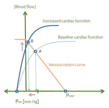 Figure 1: An increase in cardiac function from point A to point B. Note that right atrial pressure [x-axis] falls - red arrow and blood flow [cardiac output or venous return] increases on y-axis [purple arrow]. The question is: does venous return increase because right atrial pressure falls, or does blood flow increase and right atrial pressure fall as a consequence? Pra is right atrial pressure, Pmsf is mean systemic filling pressure. Venous return curve is light orange, cardiac function curves are blue.
