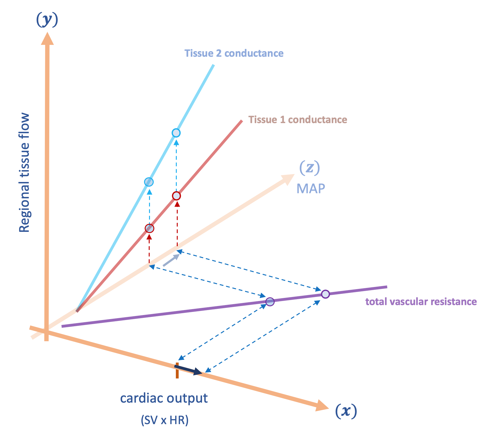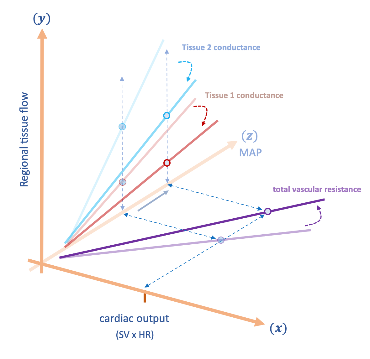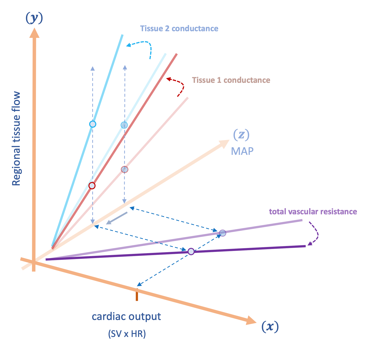 Figure 2 is identical to figure 1, however, figure 2 is combined into a single 3-dimensional plot. The x-z plane describes how cardiac output [x-axis] changes MAP [z-axis] which simultaneously acts upon the conductance of each individual tissue to drive local flow [y-axis]. Again, individual tissue conductance [i.e. slopes of blue and red lines, y-z plane] combine to determine the lumped ‘total vascular resistance’ [slope of purple line, x-z plane].