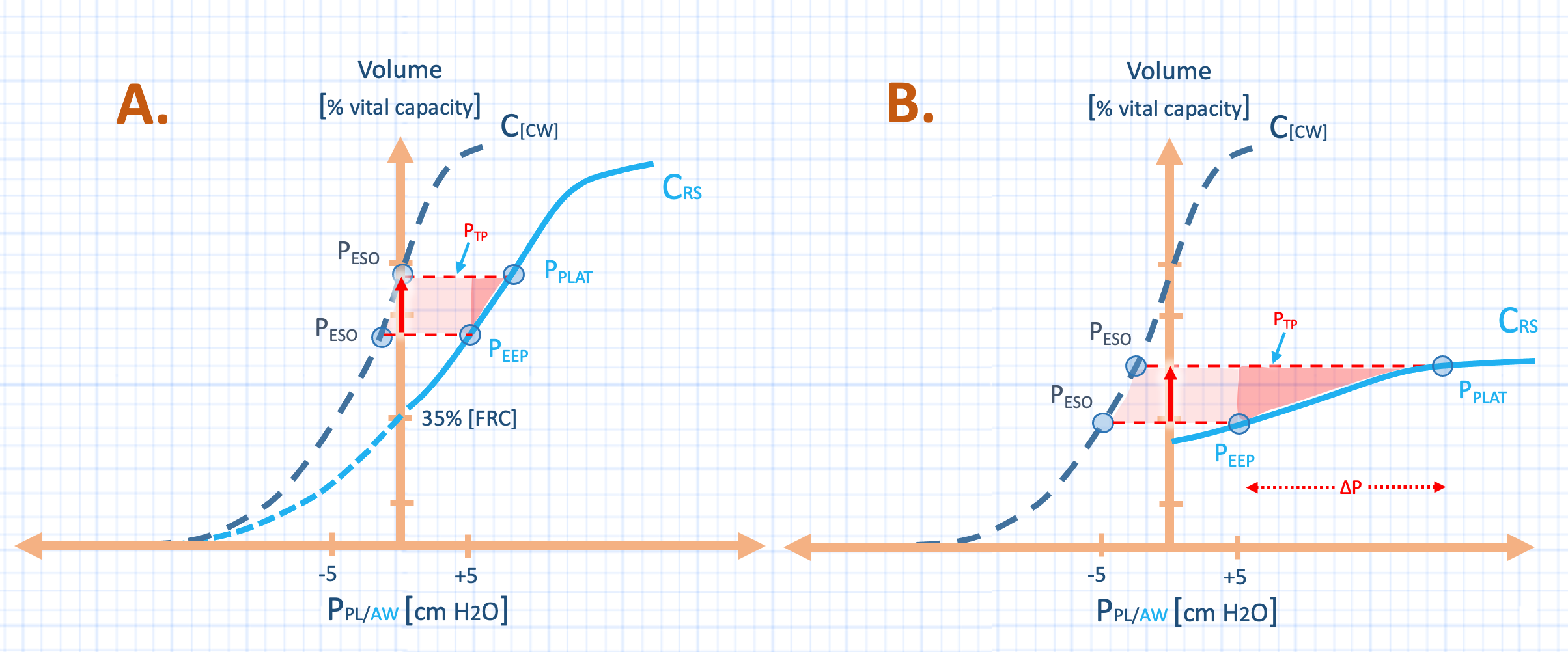 Figure 1: Illustration of work across the lung. A. shows normal conditions. Pleural pressure [Ppl] is estimated by esophageal pressure [Peso] and tracks the passive chest wall compliance curve [Ccw]. The breath starts at a positive end-expiratory pressure [PEEP] of 5 cm H2O; the tidal volume [red arrow y-axis] is about 450 mL. The breath ends at the plateau pressure [Pplat] on the respiratory system compliance curve [Crs]. The distance between the Crs and Ccw illustrates the trans-pulmonary pressure [Ptp] which is the stress across the lung from the airway pressure [Paw] to the Ppl. The shaded pink area is elastic PEEP work and the shaded red area is elastic driving work. B. shows pulmonary ARDS. The Crs is shifted down and Ccw is assumed to be constant and normal. PEEP and tidal volume are the same as A. The driving pressure [∆P] rises and elastic work, or power over time, rises significantly. This is ‘alveolo-pleural uncoupling.’