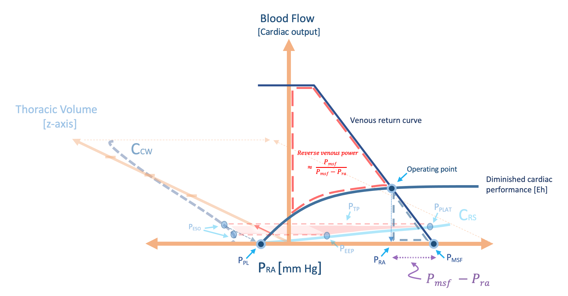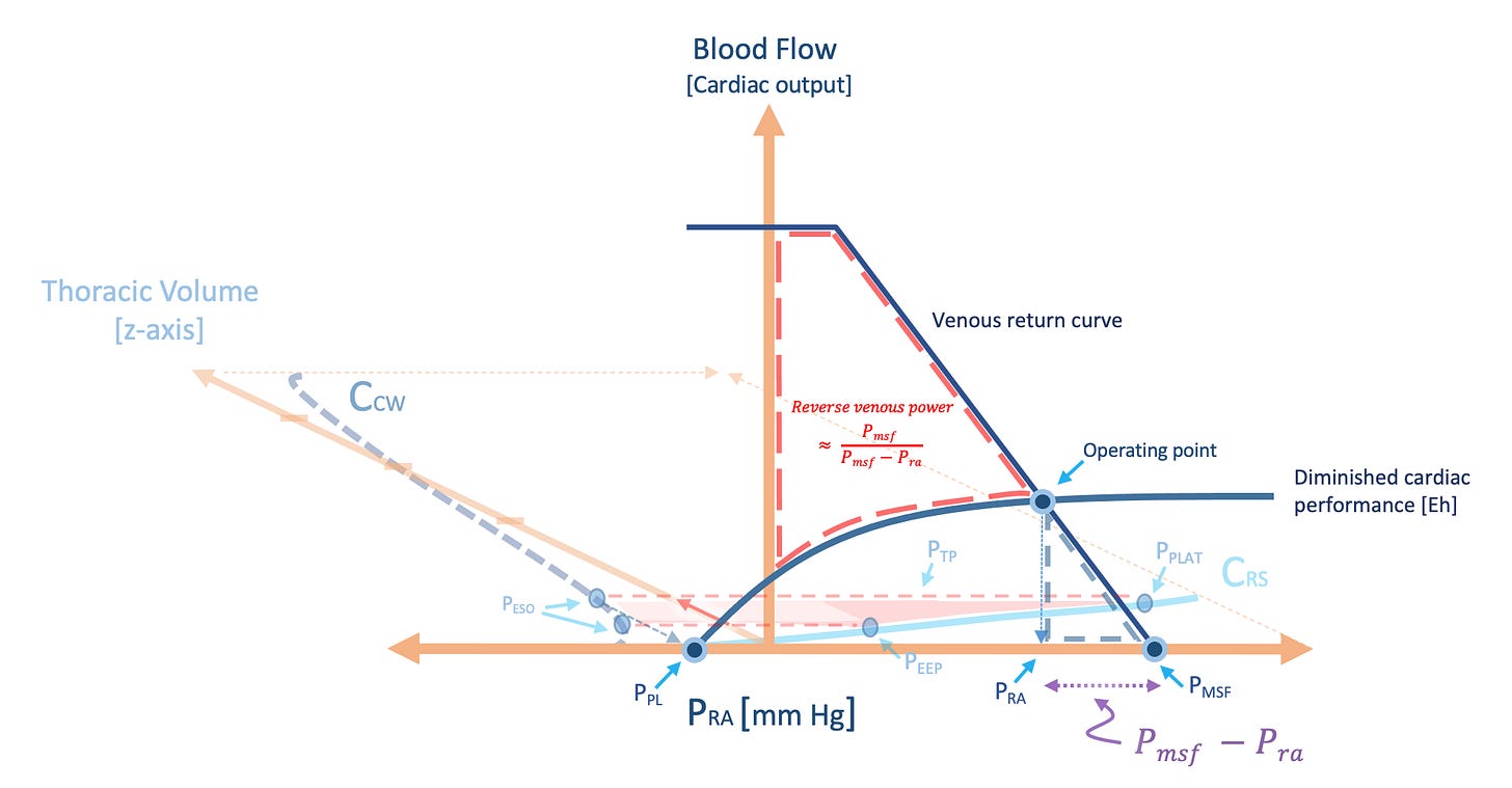 In theory, aberrant potential venous return work acts ‘backwards’ against the venous system; its extent is visualized on a Guyton diagram [figures 3 & 4]. Its value is, therefore, approximately the inverse of cardiac performance [Eh]. Accordingly, ‘reverse’ venous power is directly proportional to Pmsf and inversely proportional to the difference between the Pmsf and right atrial pressure. Inordinate potential venous return work is expected to dilate the great veins to their elastic limit and enhance venous velocity pulsatility – as seen on great vein Doppler [20-23]. Consequently, aberrant venous velocimetry suggests not simply elevated Pmsf [e.g. elevated venous blood volume] but also impaired cardiac performance [i.e. diminished Starling curve slope]. Diuresis may reduce Pmsf and also improve cardiac performance if elevated blood volume also impairs cardiac function [e.g. stretch-induced afterload elevation, functional regurgitation, dysrhythmias]. However, therapy that specifically lowers pulmonary arterial impedance [e.g. optimizing pulmonary driving power, inhaled vasodilators, prone position] or improves cardiac performance, in general [i.e. lower right atrial pressure relative to Pmsf] should also mitigate venous ergotrauma. As always, clinical context steers physiology [figure 4].