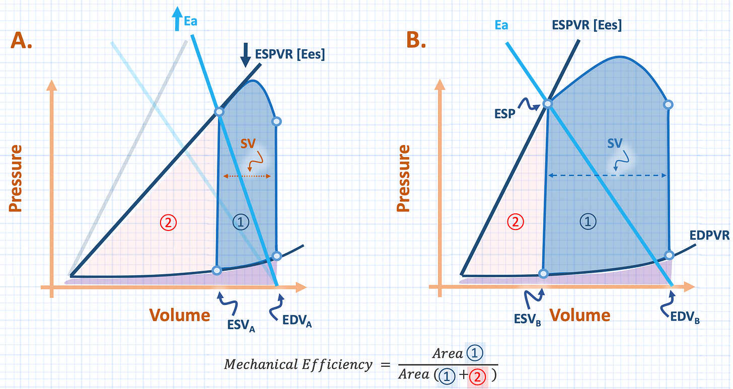 Figure 2: Ventriculo-arterial uncoupling. A. demonstrates increased impedance [e.g. ‘afterload’] as arterial elastance [Ea, light blue] rises relative to the end-systolic pressure volume relationship [ESPVR, which also falls here for illustrative purposes]. Note the effect of increased Ea relative to ESPVR, increases end-systolic volume [ESV, compare ESVa to ESVb] which reduces stroke volume and, therefore, stroke work relative to total work [mechanical efficiency]. B. shows normal coupling. Red shade shows ‘potential’ cardiac work [circle 2], blue shade is stroke work [circle 1] and purple shade is cardiac filling work. Note these graphs represent a single cardiac cycle.