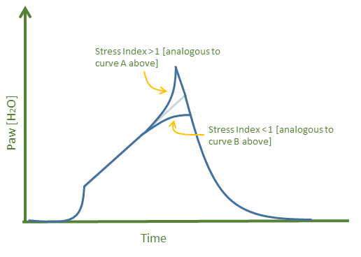 One method for qualitatively evaluating respiratory mechanics – which flows from the physiology above – is the stress index [12]. If examination of the terminal portion of the pressure-time curve on the ventilator [again, in a volume-cycled mode of ventilation] demonstrates curvature away from the pressure axis [which approximates curve B above] there is said to be a stress index < 1 or tidal recruitment. By contrast, if the terminal portion of the pressure-time curve bends towards the pressure axis on the ventilator, curve A above is approximated, and represents tidal over-distension [stress index > 1]. Note that on the ventilator, pressure is on the y-axis, not on the x-axis as above. Also on the ventilator, time in on the x-axis rather than volume. The absolutely crucial point here is that when measuring the stress index, flow must be constant [square wave delivery] as when flow is constant, volume and time become linear analogs [13]. In other words, flow must be constant so that deformations of the pressure curve reflects alteration in the elastic properties of the lung rather than demonstrating changes in flow.