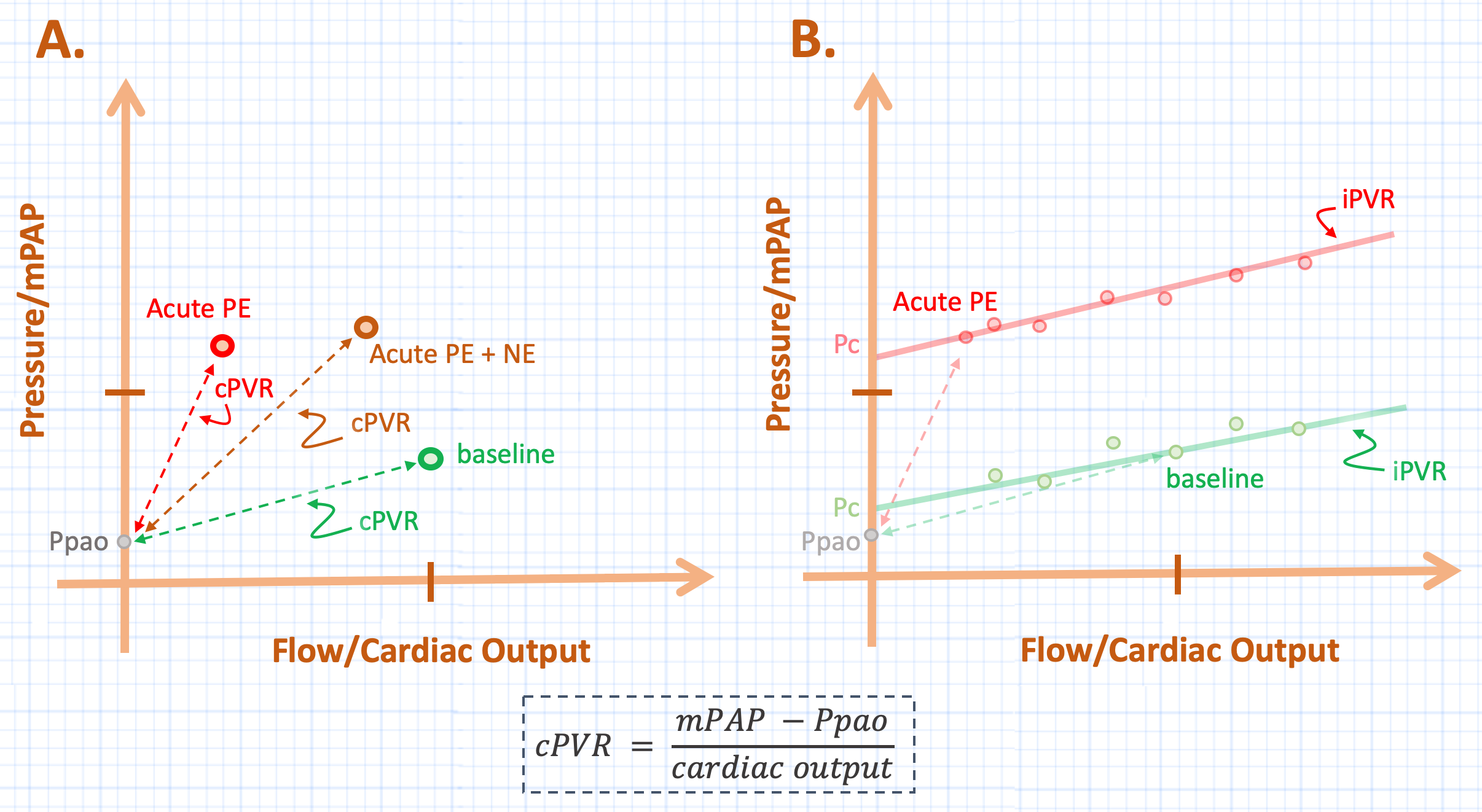 Now imagine that this unfortunate patient suffers a very large PE. The mPAP rises and the cardiac output falls as depicted by the red point in figure 1A. Assuming a constant Ppao, it is easily visualized that the slope of the line connecting the mPAP to the Ppao has risen; that is, the cPVR has increased [red dotted line]. In other words, for a given change in flow on the x-axis, the change in pressure on the y-axis is greater.