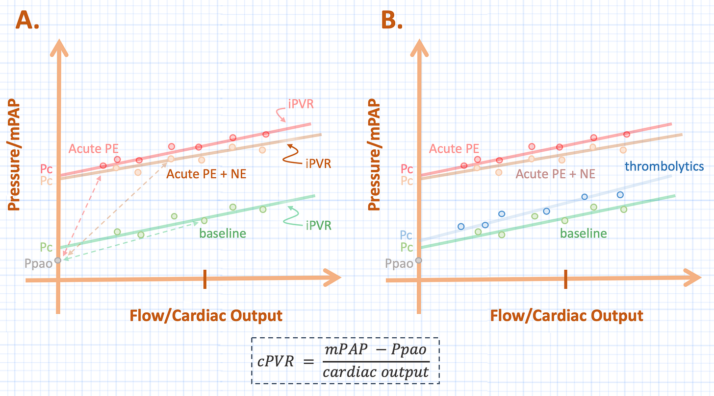 Finally, imagine initiating a NE infusion. The alpha effects of the drug improve the gradient for venous return [9], stimulating the Frank-Starling mechanism and the mild inotropic effects increase the contractility of the heart. Accordingly, blood flow along the x-axis increases and the mPAP climbs as more blood fills the pulmonary circuit. This is illustrated by the orange point in figure 1A and the dotted line connecting it to the constant Ppao demonstrates that the cPVR has decreased; in other words, as compared to the cPVR during acute PE [red dotted line], the change in pressure for a given change in blood flow is less with NE [orange dotted line].