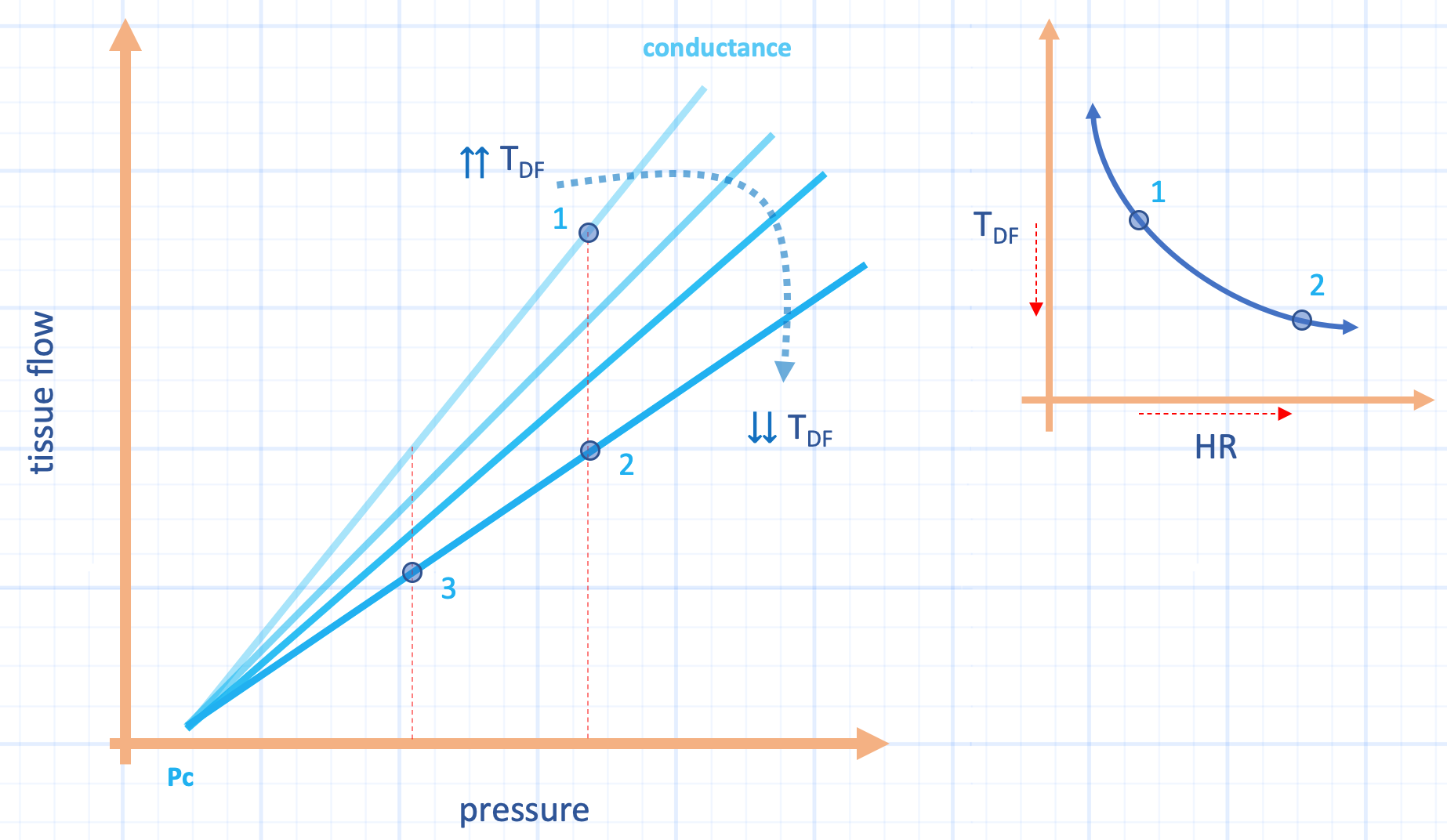 Figure 1: Hypothetical effect of heart rate on diastolic time fraction [Tdf] and conductance. The effect of increasing heart rate [HR, x-axis, inset] from point 1 to 2 on the inset shows large drop in Tdf [y-axis, inset]. This effect decreases subendocardial conductance [slope of light line blue lines]. Thus, tissue flow [y-axis] falls to point 2 secondary to high heart rate. Healthy hearts can blunt the effect of decreased Tdf by vasodilation [which increases conductance] and also, increased heart rate tends to raise diastolic pressure, elevating the x-axis. During septic shock, however, as diastolic pressure falls, especially with high heart rate [i.e. high DSI], perfusion falls to point 3. Pc is closing pressure and assumed constant for clarity.