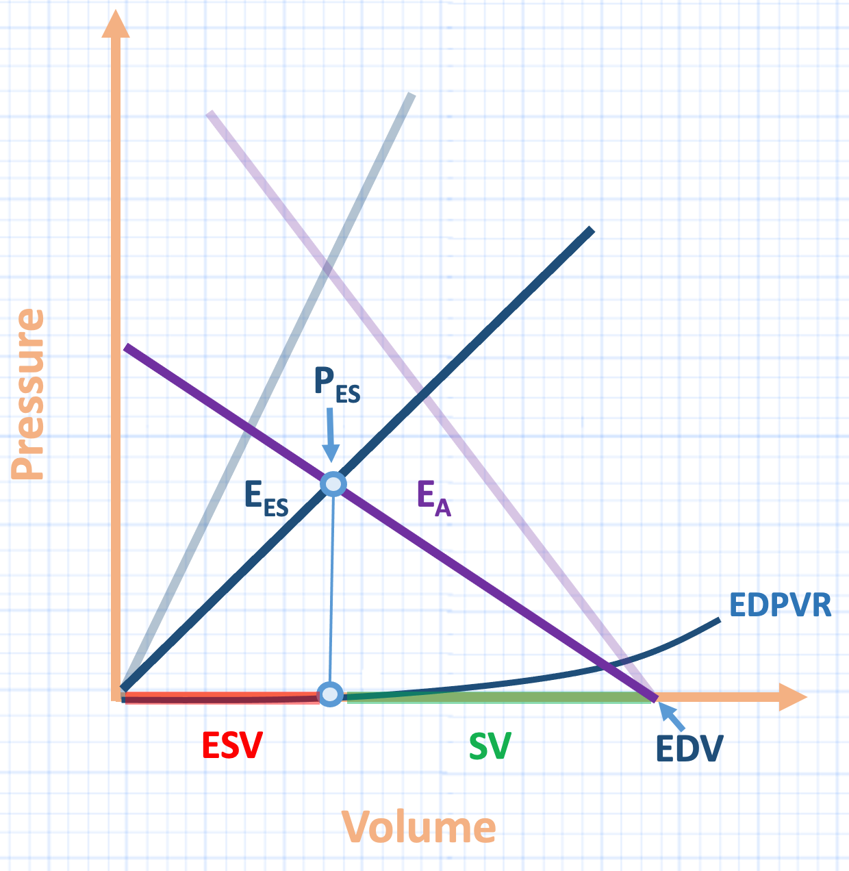 Figure 1: Illustration of ventricular pressure-volume loop [light blue], with superimposed arterial elastance [Ea, purple line]. Pes is end-systolic pressure, Ees is end-systolic elastance, ESV is end-systolic volume, SV is stroke volume, EDV is end-diastolic volume, EDPVR is end-diastolic pressure-volume relationship. Note the two right triangles formed by the slopes of Ees and Ea. Note also that this analysis assumes a left ventricular unstressed volume [Vo] of zero, or the Ees passing through the origin. When Vo is >> than zero, this approach is not valid. The slope of the hypotenuse of triangle 1 is the Ees defined as Pes over ESV. The slope of the hypotenuse of triangle 2 is the Ea defined as the Pes over SV. Ea is considered a positive slope with respect to the arterial tree during systole [i.e., rising pressure with rising volume].