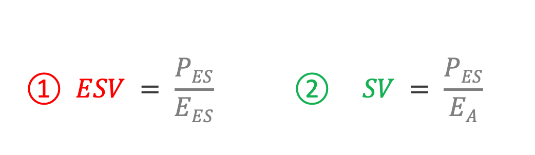 The arterial load faced by the LV is described by the ‘three-element windkessel model,’ which is a challenging measure of afterload to obtain clinically [1]. Thus, the arterial elastance [Ea] is used as a ‘lumped’ surrogate of the afterload. The Ea is insensitive to preload and contractility and is in the same units as Ees because it measures a change in pressure [mmHg] for a change in volume [mL]. The slope of Ea is measured as the end-systolic pressure [Pes] relative to the stroke volume [SV]. The ratio of the Ea to Ees defines VAC, as above.
