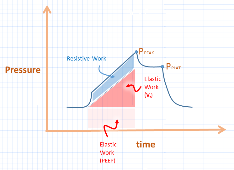 As the area of each of these three sub-components represent work, they can be summed to obtain the total work for a single inspiration. The areas can be computed by simple geometry because the PEEP-related elastic work [in pink] is a square, the tidal volume-related elastic work [in red] is a triangle and the resistive work, in blue, is approximated by a parallelogram.