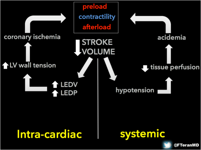 I. The failing pump and hemodynamic rationale for the use of MCS devices The rising field of mechanical circulatory support (MCS) offers a spectrum of therapies and devices with the potential to rescue patients with life-threatening cardiogenic shock1. Traditionally within the domain of cardiothoracic surgeons and interventional cardiologists, the expansion of indications for some of these support strategies outside the operating room and cardiac catheterization lab creates the need for multidisciplinary teams to care for these patients. Emergency physicians and intensivists must be familiar with developments in this field, as they often are the first providers to encounter the patient and therefore play a key role in directing their care during the crucial initial hours. Understanding the vicious cycle of pump failure Cardiogenic shock is often defined as sustained hypotension (SBP < 90 mmHg or 30 mmHg bellow known baseline), low cardiac output (CO) defined by cardiac index (CI) < 2.2 l/min/m2, high central filling pressures defined by pulmonary capillary wedge pressure (PCWP) > 12 mmHg and signs of diminished tissue perfusion. From a physiological standpoint, what specifically distinguishes cardiogenic shock is the mechanical impairment of the pump function (contractility), which leads to insufficient CO. When patients develop pump failure, they enter a vicious cycle of intra-cardiac and systemic changes, which lead to a further decrease in the SV. Increased LV end-diastolic pressures lead to increased LV wall tension, which leads to coronary ischemia affecting contractility. The systemic hypotension resulting from the fall in SV leads to tissue hypoperfusion with subsequent acidemia, which further impairs contractility.