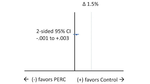 In the follow-up period, the primary outcome of VTE occurred in 0.1% (one patient!) of the PERC group and 0.0% (zero patients!) in the control group. This is where it can get confusing. First, as mentioned in our article, JAMA does the sign/polarity of the 95% CIs the opposite of most other journals, where negative favors the new therapy. Thus the reported 95% CI of -infinity to +0.8% means here that negative infinity extends in the direction of the control group and the data are consistent with up to an 0.8% increase in 3-month VTE with the PERC strategy. It's unfortunate that JAMA does not routinely use a CONSORT inspired figure to display 95% confidence intervals, so I made one for you (2-sided):