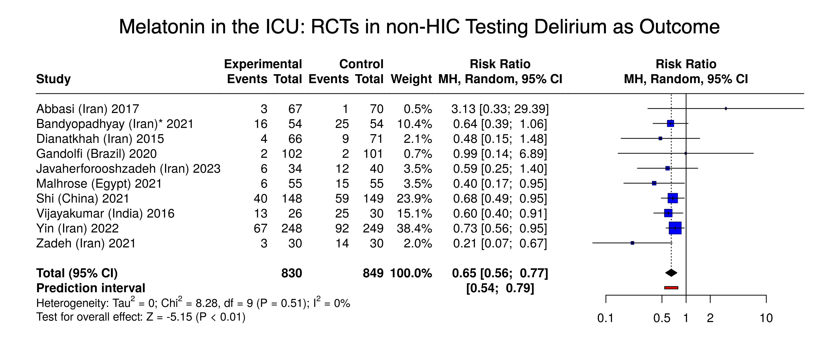 Now let’s combine the studies conducted outside high-income countries that tested melatonin vs placebo or no melatonin for the outcome of delirium (n=1,679):