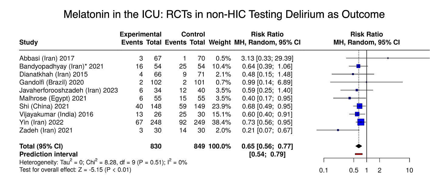 We’ll skip the forest plot on this one, but consider the fact that 11 of the 14 trials outside high-income countries reported numerical reductions in ICU stay in their melatonin group.