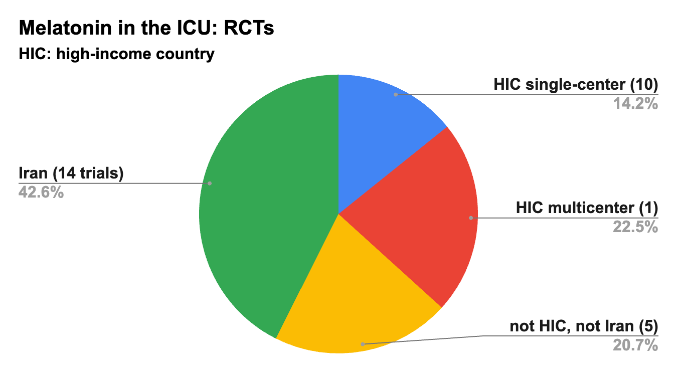 There seems to be a particular focus on melatonin research in ICUs in Iran. Almost half of the trials were performed there, encompassing 43% of the patients studied.