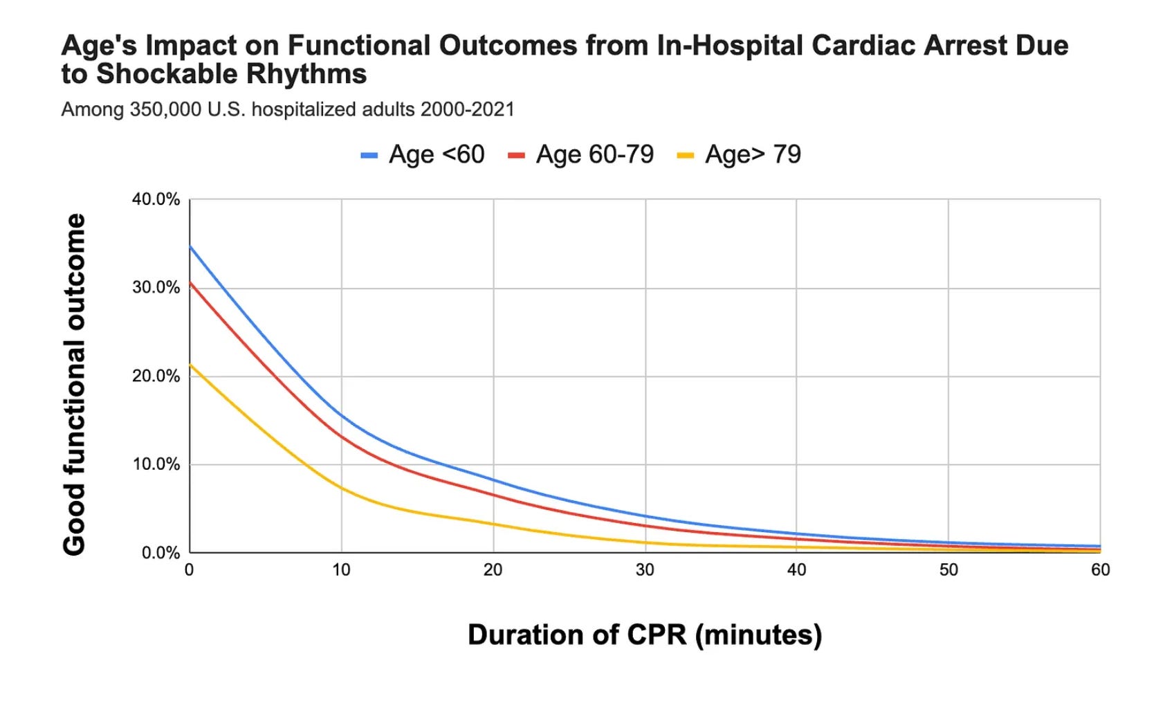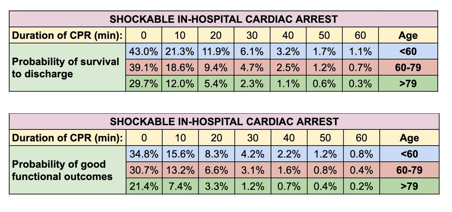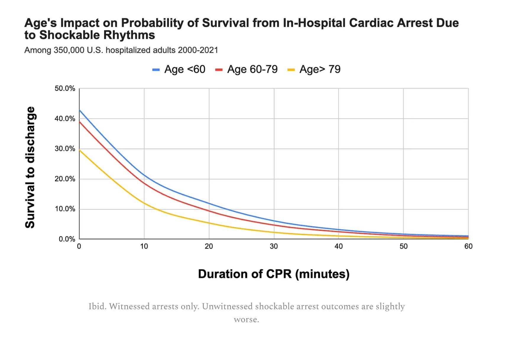 If resuscitated at 20 minutes of CPR after an in-hospital witnessed shockable arrest, an 82-year-old woman has a ~1 in 20 chance of survival, and a ~1 in 30 chance of surviving with a good neurologic outcome. Probabilities decline steeply with increasing duration of arrest.