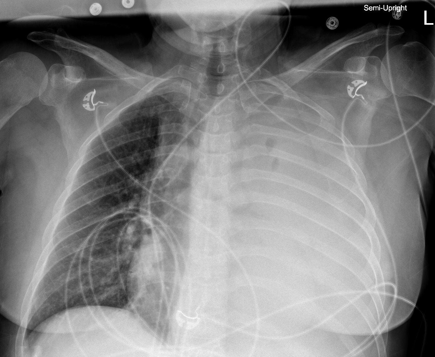 He was electively intubated, and a chest tube was placed with 2 liters of straw-colored fluid evacuated immediately.