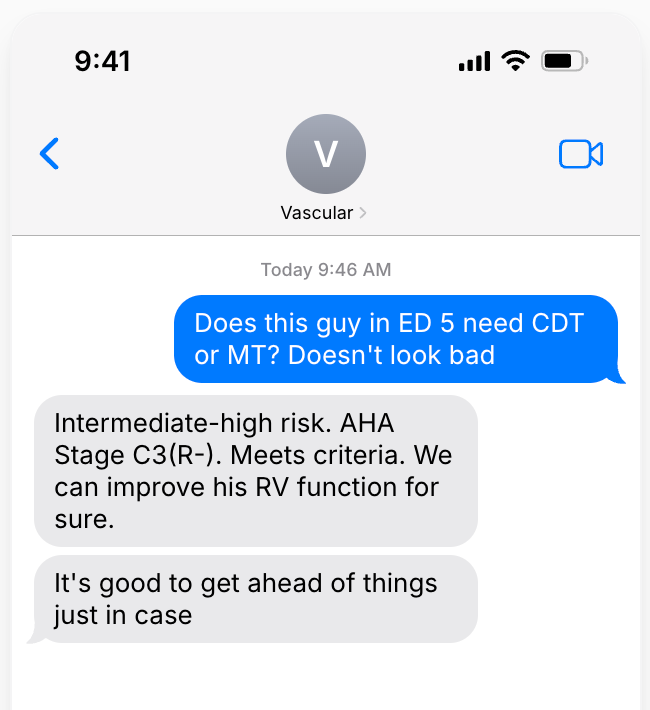 You call the interventionalist, who doesn’t pick up, so you send a text.