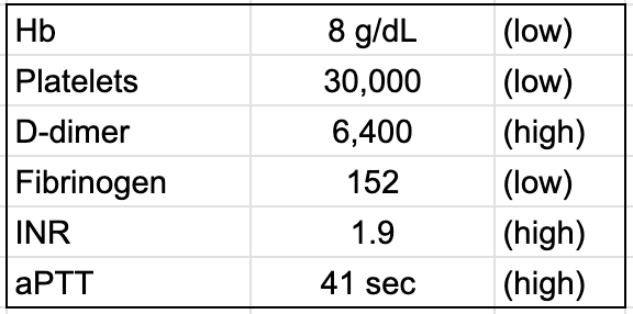 The DIC diagnosis is made on the basis of compatible clinical and laboratory findings. CBC, PT/INR, aPTT, D-dimer, and fibrinogen are commonly checked and reveal a coagulopathy. Peripheral blood smear often shows scant schistocytes and helmet cells consistent with a microangiopathic hemolytic anemia, but not as pronounced as in more fulminant MAHAs like thrombotic thrombocytopenic purpura.