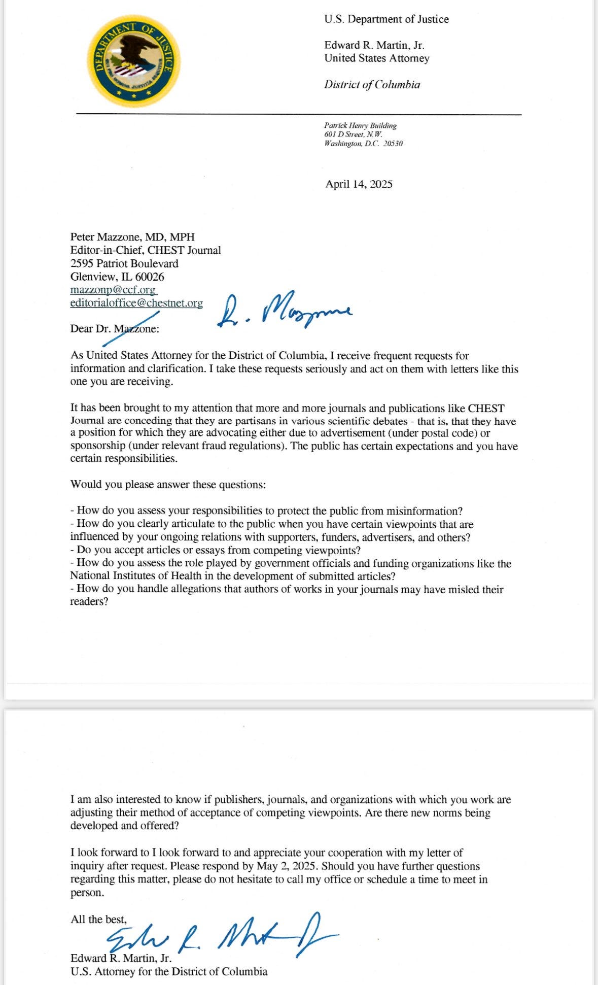 Edward R. Martin Jr., U.S. Attorney for the District of Columbia, sent an intimidating list of questions to the editor of Chest and at least two other medical journals, accusing them of bias and pointedly asking if they planned to change their ways.